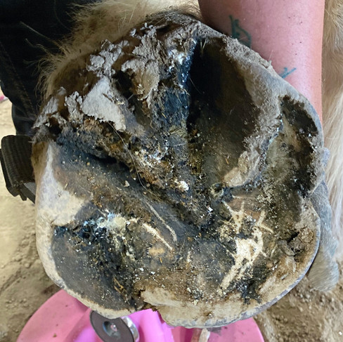 So what happens now if the thrush has reached that sensitive frog? We take strides to get it taken care of and make sure measurements have been put in place to keep it from happening again. There are many different products out there that say it's effective in treating thrush, but not all products actually follow through. Some products I have found to be successful at treating thrush can be found in the recommendations page of my website. What I have found the most effective of getting thrush under control and the horse sound is balancing the minerals in their diet especially copper and zinc.